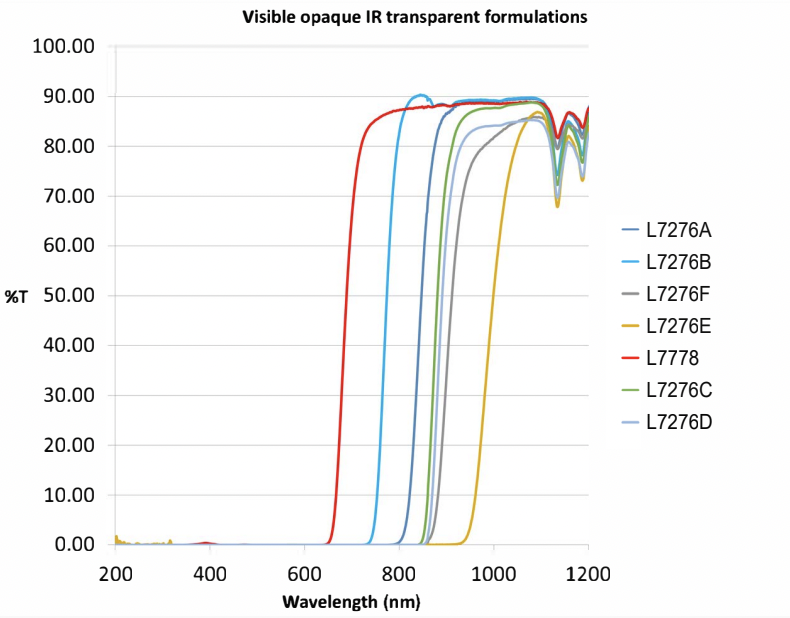 These products are known as near-infrared cut-on filters or long wavelength band-pass filters. They are designed to block UV and visible light while transmitting NIR (Infrared) light. These products produce both an aesthetic effect by hiding the electronics as well as an improvement in device functionality. By blocking the spectrum up to the sensor detection wavelength a signal-to-noise ratio improvement of up to 90% can be realized. Epolin provides several products with a range of cut on wavelengths matching industry-standard Sensors and LED emitters. To learn more download this informational flyer on Visible Opaque solutions.